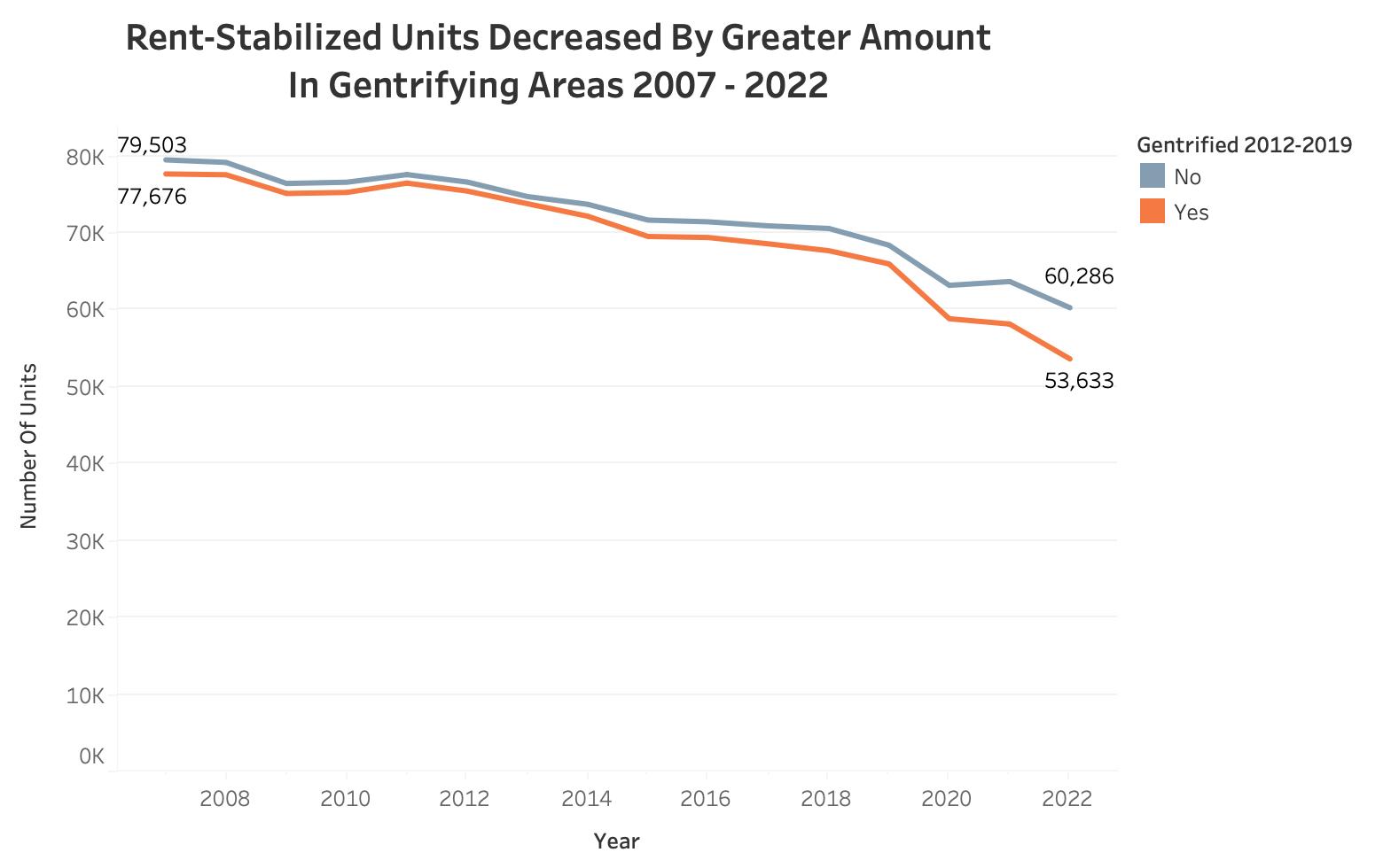 Rent‑stabilized units declined more sharply in gentrifying ZIP codes, with the gap widening substantially after 2012.