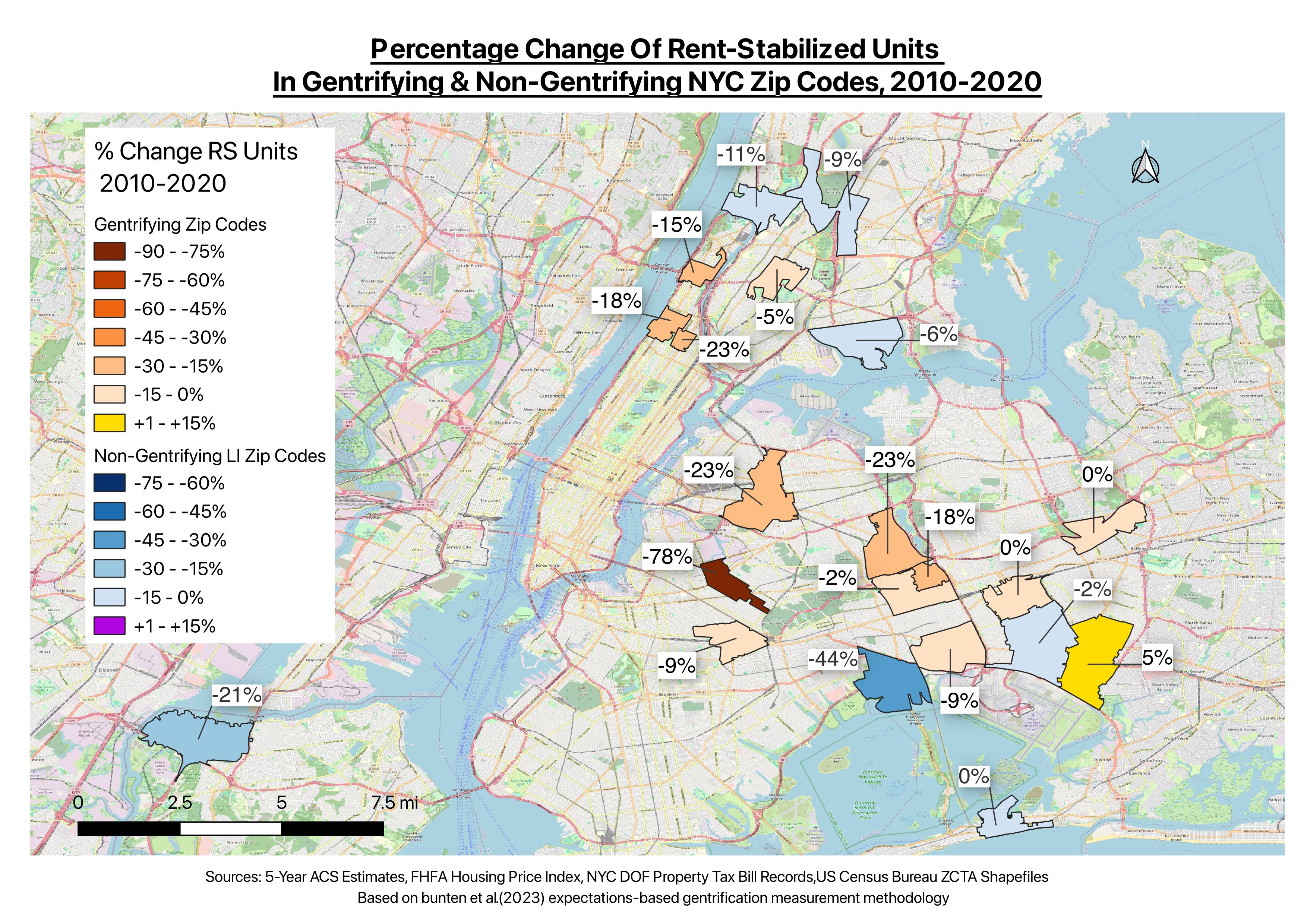 This project examines whether gentrification—understood as a financialized process driven by expectations of future rent growth—is associated with greater loss of rent‑stabilized housing in New York City.