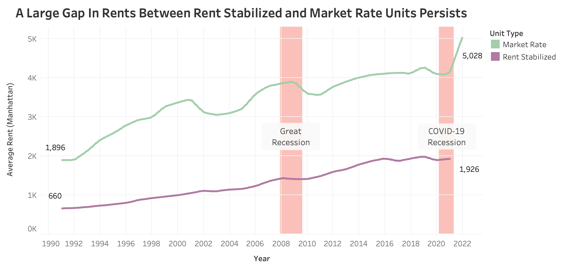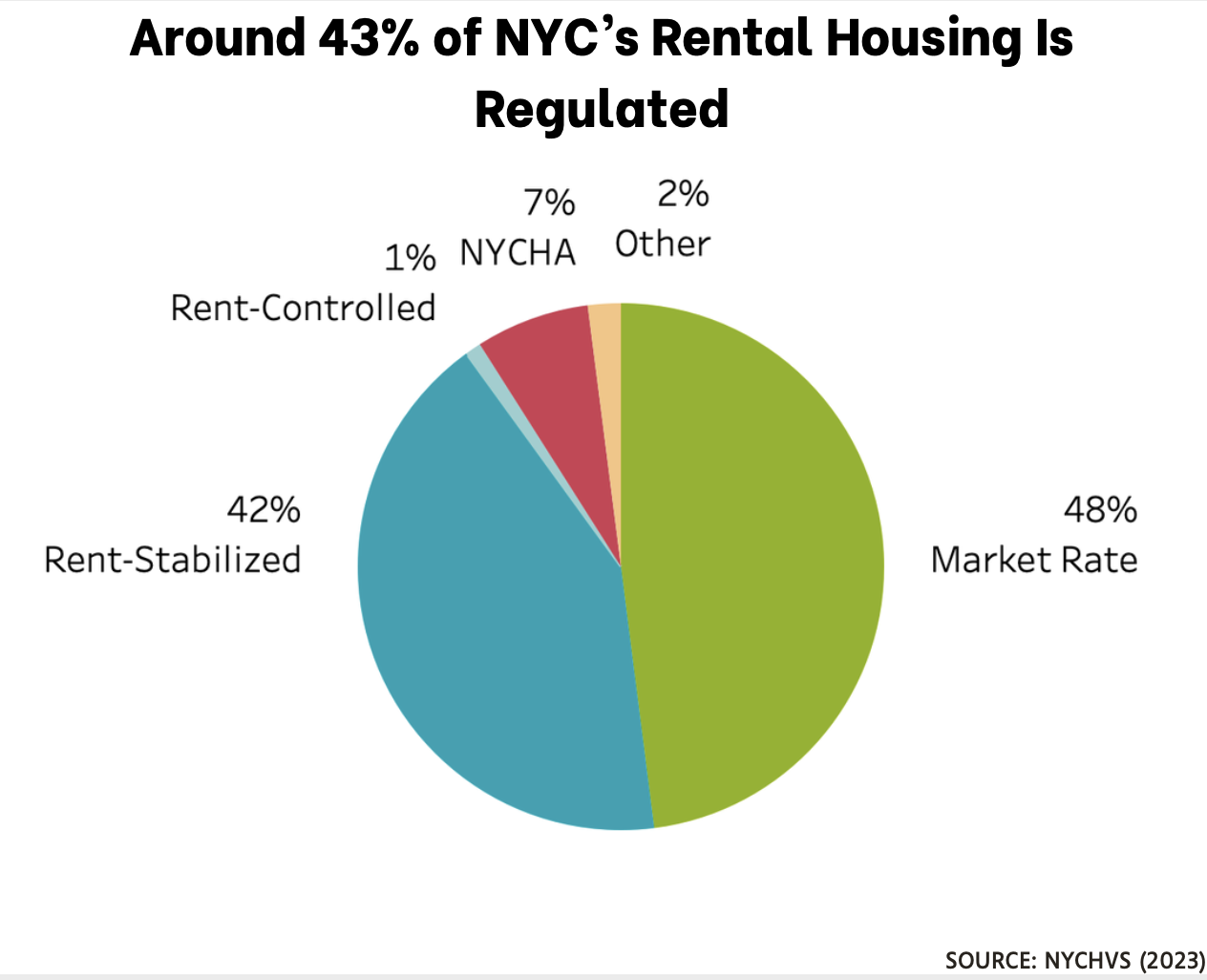 Around 43% of NYC’s rental housing is regulated, primarily through rent stabilization. While rent regulation remains one of the most accessible affordability tools for New Yorkers, it also creates incentives for deregulation when gaps between regulated and market rents widen.