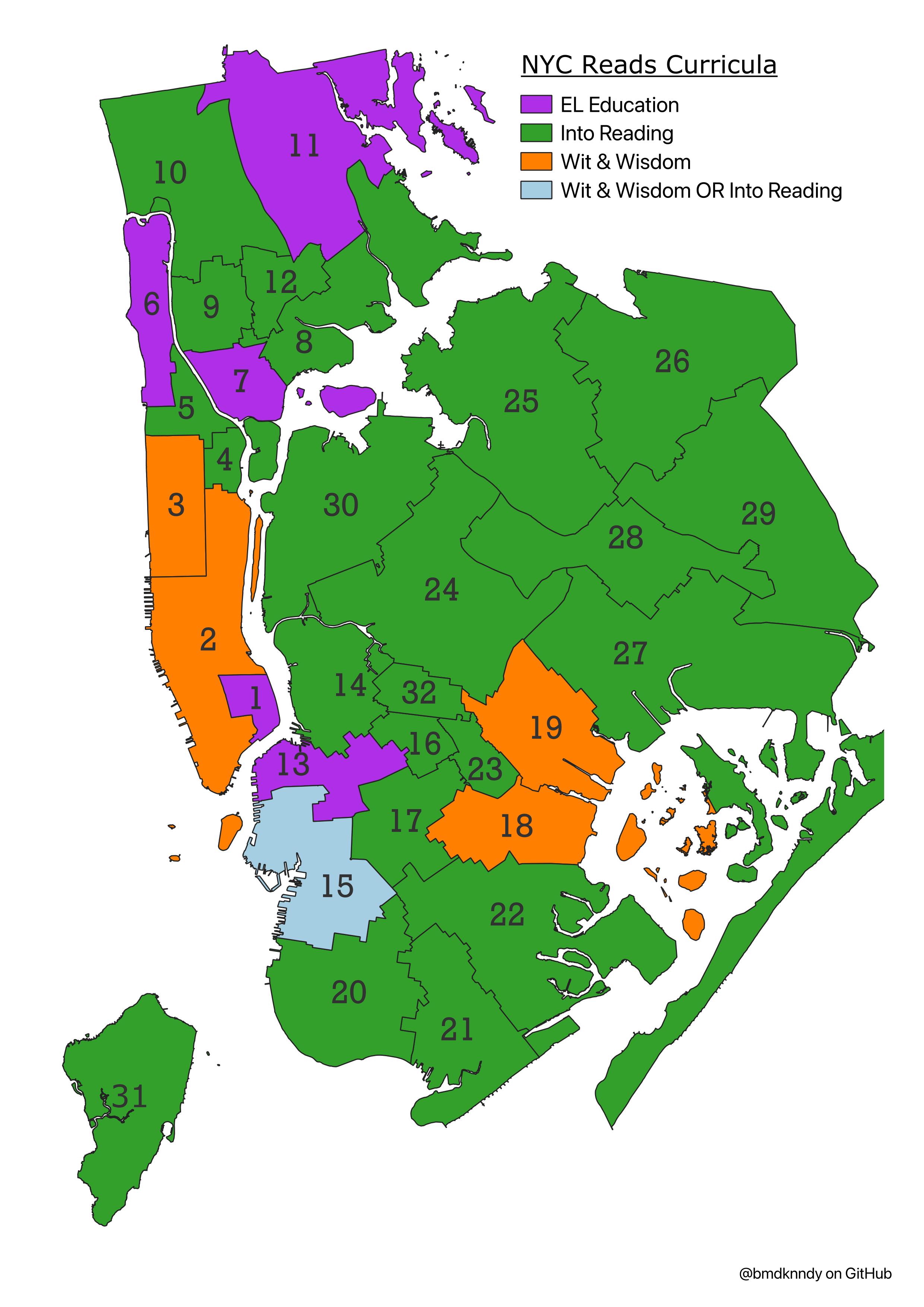 Created school-level dataset and map via Python, R, and QGIS for use by educational staff and volunteer tutors at Goddard Riverside to determine the curriculum used by the students they serve based on 2024 NYC Department of Education updates to citywide reading curricula. Queried school information from NYC DOE using Python (nycschools) and extracted curricula from an image provided by DOE using OCR in R (tesseract). Visualized district-level map in R (ggplot2, sf) and QGIS.
